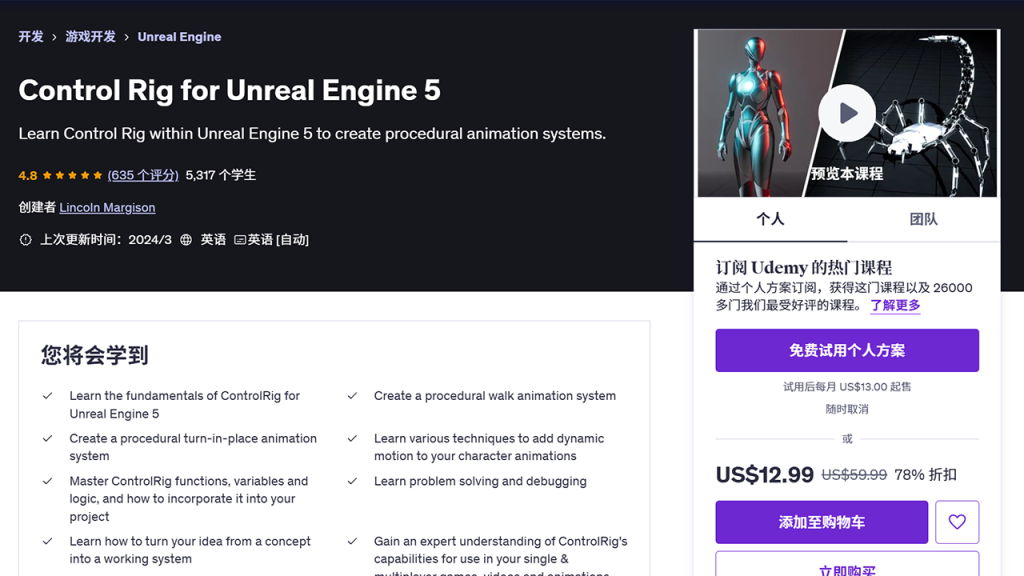 掌握 Control Rig 基础用法,制作程序化行走与就地旋转系统,学习动画变量、节点逻辑与调试方法,打造与环境智能交互的角色动画。