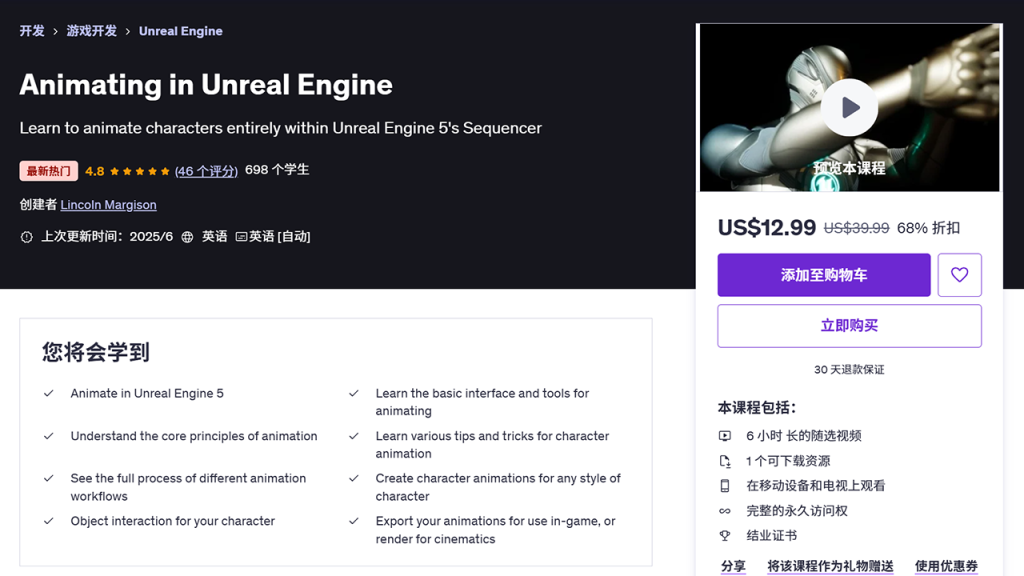 掌握 Control Rig 基础用法,制作程序化行走与就地旋转系统,学习动画变量、节点逻辑与调试方法,打造与环境智能交互的角色动画。